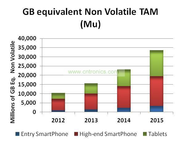 對于存儲器的市場需求,陶女士預測,2012年全球半導體市場將達到$313B,其中DRAM達到DRAM $32.1B,Flash 達到$32.4B,這兩塊加起來占到全球半導體市場的20%以上。非易失性的存儲器將從2012年到2015年一直以直線方式增長。對于Entry Smart,目前非常重要的趨勢是從NAND向e.MMC+LPDDR1/2方向發展。它的容量是4-8GB e.MMC 疊加 2-4Gb LPDRAM。針對高端智能機,由于它對EMC性能的要求更高,所以對于一些高性能的智能機,容量主要集中在由8/16GB,后續向64GB e.MMC發展,現在已經出現32GBe.MMC。在平板這一塊,由于它高容量的需求,目前基本上是從16GB一直到將來的256GB發展,從2012年趨勢來看,將達到128GB,到2015年,大部分需要達到256GB。