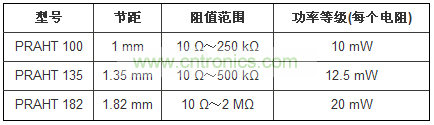 PRAHT系列的節(jié)距為1mm、1.35mm或1.82mm,阻值為10?~2M?,每個(gè)電阻的功率等級(jí)為10mW~20mW。器件具有小于-35dB的低噪聲,電壓系數(shù)小于0.01ppm/V。符合RoHS的電阻網(wǎng)絡(luò)提供工作溫度可達(dá)+230℃的金端接,或溫度為+200℃的SnAg端接。