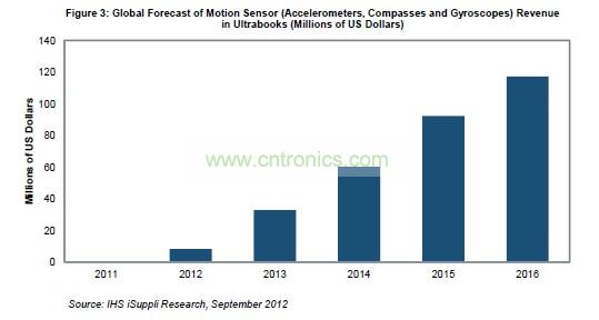 在超級(jí)本的帶動(dòng)下,包括加速計(jì)、陀螺儀和羅盤在內(nèi)的運(yùn)動(dòng)傳感器的全球銷售額到2016年將達(dá)到1.173億美元,而2012年只有830萬美元,2012-2016年的復(fù)合年度增長(zhǎng)率高達(dá)93.9%,如圖所示。