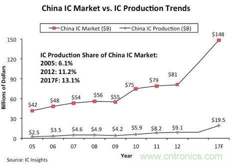 市場研究機構IC Insights的最新預測報告指出,中國IC市場可望在2012~2017年之間,以13%的復合年平均成長率(CARG)持續擴張,報告同時指出,中國IC市場持續擴張的背后,主要依靠來自外國制造商在中國地區的大規模投資建廠。