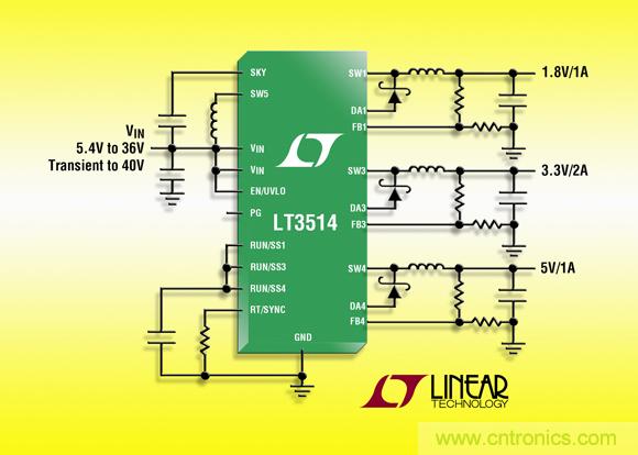 【導(dǎo)讀】凌力爾特推出具100% 占空比操作能力的 36V 輸入電壓、三通道、2A + 1A + 1A (IOUT) 降壓型開(kāi)關(guān)穩(wěn)壓器LT3514。同時(shí),它具備恒定頻率、堅(jiān)固的抗短路性能等優(yōu)勢(shì),非常適用于需要多個(gè)輸出的汽車(chē)和工業(yè)應(yīng)用。
