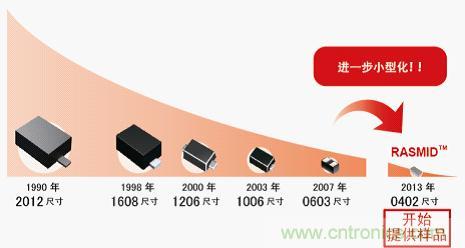 【導讀】ROHM采用全新工藝方法,開發出超越微細化界限的世界最小元器件“RASMID™系列”,有助于移動設備進一步小型化。本文從ROHM的RASMID™系列的特點、二極管的小型化歷史等方面進行介紹。