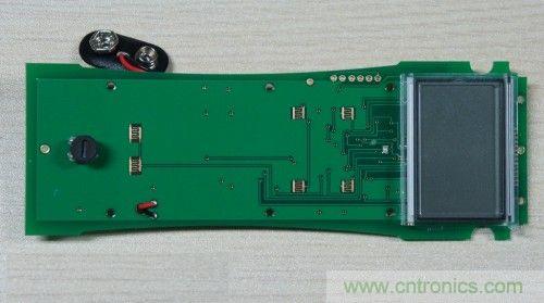 翻轉板卡,另一面的電路就更少了,除了一個段式的LCD模塊,以及幾個功能按鍵(黑色旋鈕為校準溫度的變阻器),就沒什么東西了,有意思的是段式LCD模塊與PCB板的連接方式。