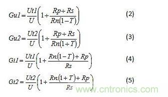 現(xiàn)在我們應該把實際閾值點(δi, δs)和想要的閾值點(±T)區(qū)分開來,后者通常相當于容差R加上一些安全余量。注意,為了簡化分析,我們假設想要的閾值點剛好相反。通過選擇增益開展模型調(diào)整,目的是使δi = (-T)和δs = T。基于這樣的考慮,模型增益見下面的公式(2)、(3)、(4)和(5)。在這些公式中,U、Ut1、Ut2和Rp的選擇對于最大限度地提高性能來說很關鍵。這個課題后面再討論。