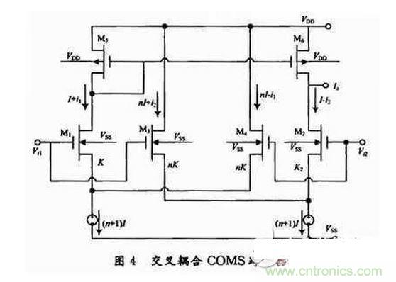 本文采用經典的交叉耦合差動式COMS跨導器,其I/V傳輸特性有理想的線性關系。圖4中,M1和M2偏置電流為I;M3和M4偏置電流為 nI。電路設計中,M1~M4有相同的溝道長度L,M3,M4的溝道寬度W=nL。設Y1=i1/I,Y2=i2/I,X=Vid/Vb,則: