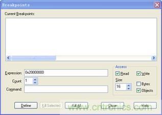 具體定義方法:在Expression內(nèi)輸入變量的地址,然后選擇讀寫屬性,并正確設(shè)置字節(jié)范圍,最后點(diǎn)擊Define即可。例如,在地址0x20004000開始,16字節(jié)范圍內(nèi),定義讀寫斷點(diǎn)操作,具體設(shè)置方法如圖4所示。