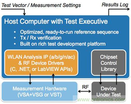 非信令測試還要求主機(jī)具有芯片組供應(yīng)商提供的芯片組控制庫才能在非信令模式下控制DUT。圖1顯示了這些組件如何構(gòu)成一個典型的WLAN非信令測試框架。