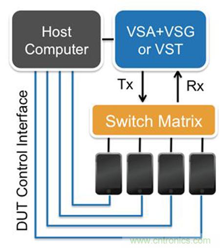 此類因素顯著增加了測試時間,繼而增加了測試成本。新的解決方案是芯片組供應(yīng)商、測試廠商以及最終用戶通過并行測試多臺 設(shè)備來最大限度提高效率,這一方法也稱為“多DUT”測試。通過利用最新的多DUT測試軟硬件架構(gòu),設(shè)備制造商可以顯著增加他們的生產(chǎn)測試吞吐量而不會增加測試成本。這里來研究和比較各種多DUT測試方案,其中圖2所示的方案是使用一個VSA+VSG或VST通過一個