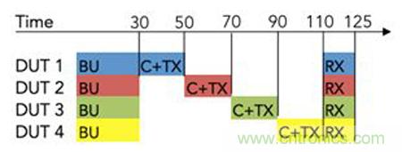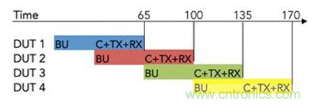 另一種減少測試時間的方法是通過向多個DUT發(fā)送相同的波形來同時執(zhí)行多個RX測試。通過將每個DUT分配到相應(yīng)的軟件線程,所有DUT均可同時啟動。使用如圖5所示的技術(shù),多DUT的測試時間相比流水線測試可減少25%,相比串行測試設(shè)備可減少超過50%。