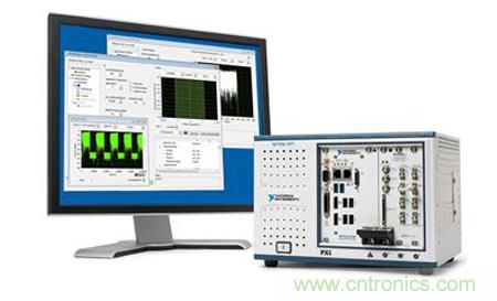 圖6:NI PXI Express機(jī)箱包含射頻分析儀和發(fā)生器、矢量網(wǎng)絡(luò)分析儀、開關(guān)、電源和嵌入式計(jì)算機(jī)