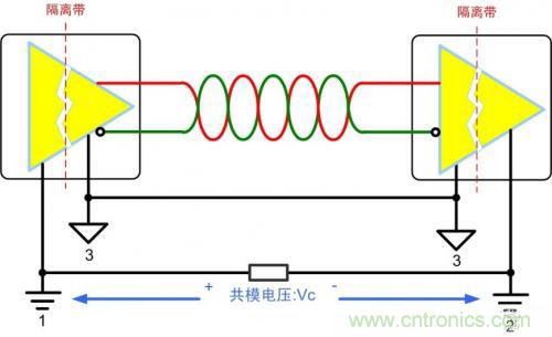 隔離收發(fā)器可將總線和控制電路進行電氣隔離,將高壓阻擋在控制系統(tǒng)之外,可以有效地保證操作人員的人身及系統(tǒng)安全。不僅如此,隔離可以抑制由接地電勢差、接地環(huán)路引起的各種共模干擾,保證總線在嚴(yán)重干擾和其它系統(tǒng)級噪聲存在的情況下不間斷、無差錯運行。如圖 1所示,使用隔離收發(fā)器后,可以有效防止形成地環(huán)路,總線參考地可跟隨共模電壓的波動而波動,共模電壓全部由隔離帶承受,共模電壓對總線信號變得不再可見,從而保證總線穩(wěn)定可靠地通信。