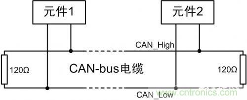 電信號在在電纜上傳輸時,當(dāng)阻抗不連續(xù)或者發(fā)生突變時,就會發(fā)生信號反射。反射的過程十分的復(fù)雜,甚至可能發(fā)生多次反射,反射的信號疊加在正常的信號上,引起電平變化,導(dǎo)致數(shù)據(jù)傳輸出現(xiàn)錯誤。為了消減這種信號反射的方法,我們是使傳輸電纜上的阻抗保持連續(xù),但是電纜總是有終點的,終點的阻抗是突變的,為了使終點阻抗保持連續(xù),CAN-Bus規(guī)定要在電纜兩端接入匹配電阻。這個終端電阻的阻值一般選用120Ω。如圖 3所示。