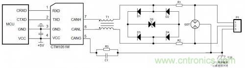 節(jié)點在戶外等惡劣的現(xiàn)場環(huán)境時,容易遭受大能量的雷擊,此時需要對CAN 信號端口添加更高等級的防護電路,保證節(jié)點不被損壞以及總線的可靠通訊。