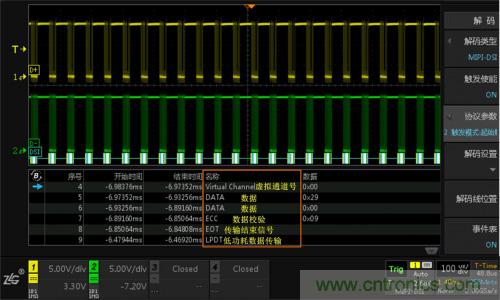 (1)現(xiàn)場模擬MIPI-DSI協(xié)議,使用數(shù)據(jù)挖掘型示波器ZDS4054 Plus,其免費標配MIPI-DSI協(xié)議低速LP模式解碼功能,具體操作如下圖7所示。