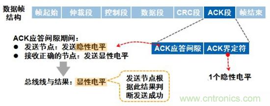 應答間隙:所有接收到匹配CRC序列(CRC SEQUENCE)的節點會在應答間隙(ACK SLOT)期間用一“顯性”的位寫入發送器的“隱性”位來作出回答,由于CAN總線線與的原理,只要總線上有一個節點正確接收到數據,則ACK SLOT就會被填入顯性電平。