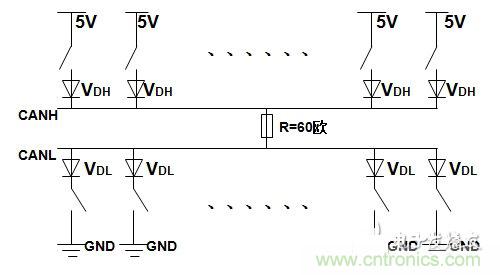 按照標準,在總線輸出為顯性時,CANH=3.5V,CANL=1.5V,差分分電平:CANH-CANL=2V,總線網絡電阻為60歐,流經終端電阻的電流約為33mA(2V/60歐);