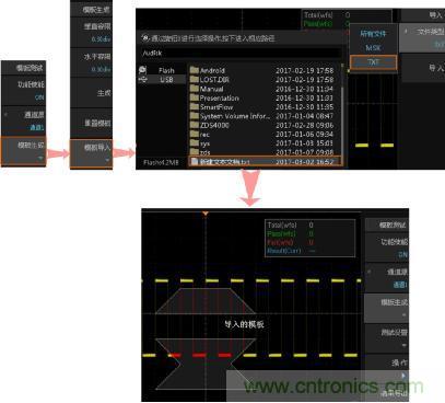 當(dāng)原始波形沒(méi)辦法滿足我們對(duì)波形的限制時(shí),用戶還可將儀器內(nèi)部Flash存儲(chǔ)器或外部U盤中存儲(chǔ)的測(cè)試模板文件導(dǎo)入,導(dǎo)入的波形可以是以前保存的*.msk文件或者是自行設(shè)置的*.txt文件。