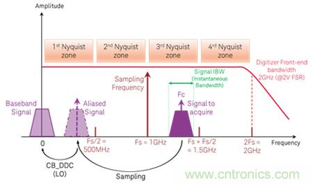 在數(shù)字化儀中,您可以考慮選擇超過(guò)采樣率(fn)一半的帶寬。有時(shí)可以通過(guò)欠采樣(undersampling)和特殊輸入濾波來(lái)捕獲大于 Fs/2 的頻率。例如,是德科技的 M9203A 和 M9703B 數(shù)字化儀支持 2 GHz 帶寬,ADC 采樣時(shí)鐘速率為 1.6 GS/s,允許使用欠采樣直接進(jìn)行下變頻。