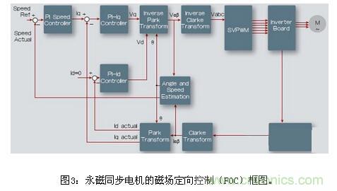 (1)電機控制IP模塊。圖3為無傳感器磁場定向控制算法,這一部分將會討論這些模塊,它們作為IP核提供。