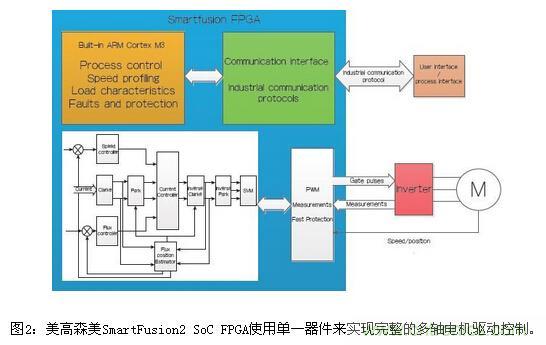 使用微控制器或DSP實現電機控制算法的方法并不容易擴展到多個以獨立速度運行的電機(多軸電機控制),美高森美SmartFusion2 SoC FPGA可以使用單一器件來實現集成且完整的多軸電機驅動控制(圖2)。