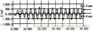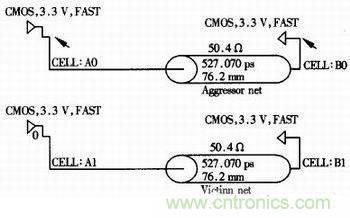 由于頻率的提高,傳輸線之間的串?dāng)_明顯增大,對(duì)信號(hào)完整性也有很大的影響,可以通過仿真來預(yù)測(cè)、模擬,并采取措施加以改善。以CMOS信號(hào)為例建立仿真模型,如圖6所示。在仿真時(shí)設(shè)置干擾信號(hào)的頻率為66MHz的方波,被干擾者設(shè)置為零電平輸入,通過調(diào)整兩根線的間距和兩線之間平行走線的長(zhǎng)度來觀察被干擾者接收端的波形。仿真結(jié)果如圖7,分別為間距是203.2mm、406。4mm時(shí)的波形。