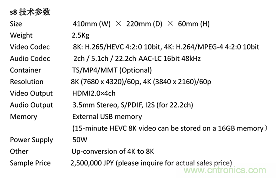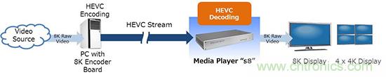 索喜科技通過搭載4枚LSI“MB86M31”組成8K HEVC實時編碼系統(tǒng),配合媒體播放器s8,完成8K影像編碼、發(fā)送、解碼、顯示所有必須的影像處理,為8K影像發(fā)送提供整體解決方案。