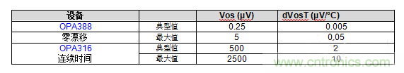 表1顯示了連續時間和零漂移放大器的Vos和dVos/dT的比較。請注意,零漂移放大器的Vos和dVos/dT要小三個數量級。