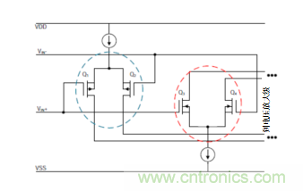 傳統的軌到軌輸入CMOS架構具有兩個差分對;一個PMOS晶體管對(藍色)和一個NMOS晶體管對(紅色)。具有軌到軌輸入操作的零漂移放大器使用圖1所示的相同互補p溝道(藍色)和n溝道(紅色)輸入配置。