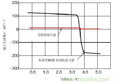 這種輸入架構的結果表現出一定程度的交越失真(有關交越失真的更多信息,請參閱零交越放大器:特性和優勢)。但是,放大器的失調會通過其內部定期的校準來糾正,所以失調變化的幅度和交越失真大大減小。圖2顯示了標準CMOS軌到軌和零漂移放大器之間的失調的比較。