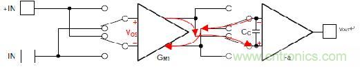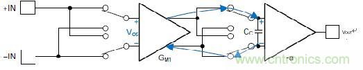 斬波零漂移放大器的內部結構可以具有與連續時間放大器一樣多的級數——主要區別在于第一級的輸入和輸出具有一組開關,用于在每個校準周期內反轉輸入信號。圖3顯示了前半個周期。在前半周期,兩組開關都配置為翻轉輸入信號兩次,但失調翻轉一次。這使輸入信號保持同相,但失調誤差極性相反。