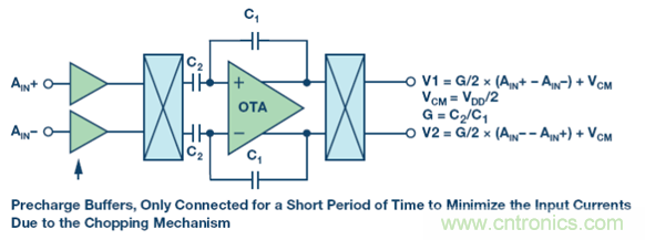 對輸入進行斬波之后,輸入頻率便調制到較高頻率。緩沖器失調和閃爍噪聲依然保持其最初的低頻率,因為它們不受輸入斬波的影響。