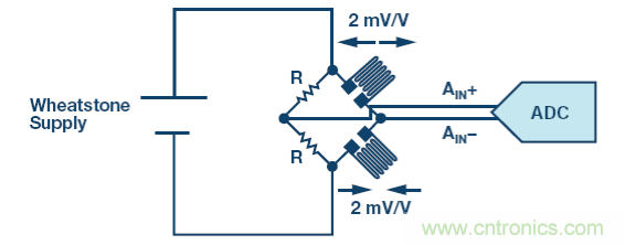 應變計的靈敏度通常為 2 mV/V?;菟沟请娫丛礁?,靈敏度也就越高。為了增加應變計的動態范圍并最大化 SNR,電橋可能采用比 ADC 更高的電源供電。