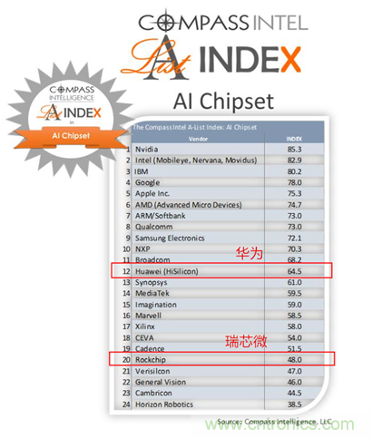 在全球前20名的AI芯片企業排名表中,中國大陸占據兩個席位,分別是華為和瑞芯微,下面我們從他們的產品布局與生態鏈戰略來看看上榜的理由。