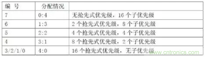 兩種優先級由4位二進制位決定。分配下來有十六種情況: