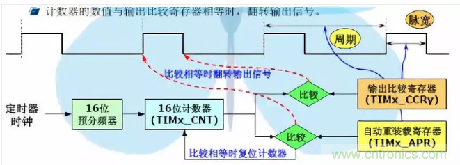 實際起作用的是影子寄存器,而程序員操縱的則是自動裝載寄存器。如果APPE位使能,表明自動裝載寄存器的值在下一次更新事件發生后才寫入新值。