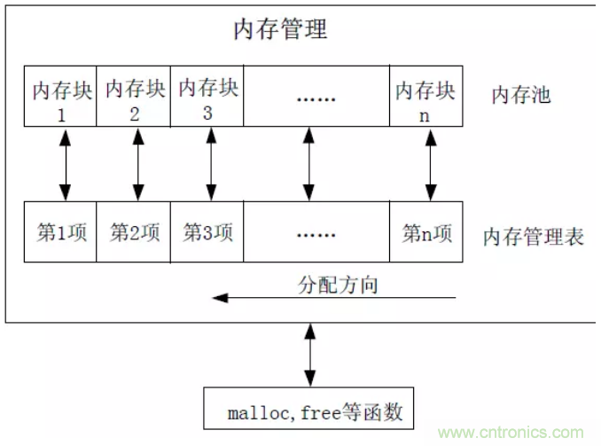 注意表中的分配方向,從頂到底。每一項對應一個內存塊。里面的數值代表了內存池的狀態:如果為0,表示該內存沒有被分配;如果非0,那么數值的大小就表示了該塊內存被連續占用的內存數。
