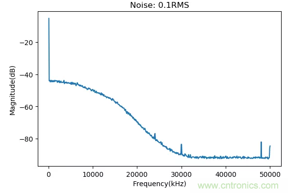 數字萬用表對于不同頻率正弦信號測量結果是不同的。由于隨機噪聲信號的頻譜擴展到了30Mhz左右,所以超過500kHz之后的頻率分量的結果都進行了衰減。