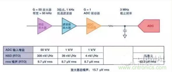 考慮一個系統采用16位ADC,其SNR值相當于100 μV rms噪聲,用作ADC驅動器的放大器具有μV rms噪聲。按和方根加總這些噪聲源,得到總噪聲為100.5 rms,非常接近ADC單獨的噪聲??梢钥紤]下面兩個讓放大器ADC更為平衡的方案,以及它們對系統性能的影響: