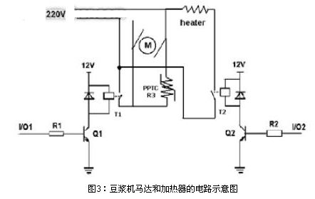 下圖3為多功能豆?jié){機馬達和加熱器的簡單電路示意圖。豆?jié){機所用馬達為220V直流馬達,繼電器的工作電壓為12V,豆?jié){機利用繼電器把MCU發(fā)出的低壓控制信號I/O來控制交流高壓信號的通斷,R3為PPTC可恢復(fù)電阻,T1和T2為繼電器。