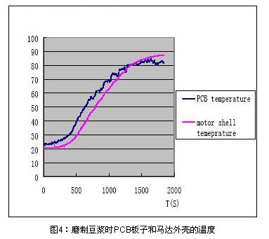 用上文所述的PPTC設(shè)計流程可以用在多功能豆?jié){機馬達防堵保護設(shè)計中,但這是往往會碰到選擇PPTC型號困難的問題,也就是說多功能豆?jié){機的馬達保護設(shè)計會較普通的小家電馬達保護復(fù)雜的多,圖4為磨制豆?jié){時PCB板周圍環(huán)境溫度和馬達外殼溫度的實測圖,可見控制電路PCB板PPTC周圍的環(huán)境溫度最高可以到達85C。由于豆?jié){機的PPTC最高環(huán)境溫度85度會比普通的小家電最高環(huán)境溫度要求高,這樣既要在85度的最大工作電流下能正常工作,還要保證在最低溫度0度的堵轉(zhuǎn)電流情況下能及時的保護,相應(yīng)的就增大了設(shè)計難度。下面就具體的闡述此類多功能豆?jié){機馬達堵轉(zhuǎn)的保護設(shè)計方案。