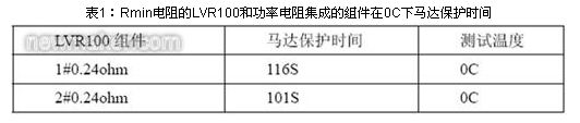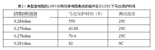 選取兩片Rmin電阻0.22ohm 的LVR100和功率電阻集成的組件,下面表1為馬達的保護時間。