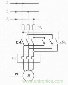 在眾多的操作系統中均要求電動機能夠實現正反轉給操作,從電動機的工做原理中可知,需將三相電源中的任意兩個進行對調,就能實現電動機的反向運轉,因此電動機實現正反轉的實質便是電源進線的調換。但若僅調換進線,容易導致電源短路,因此必須設置互鎖,圖2是三相異步電動機正反轉的原理設計圖,圖中KM1和KM2均是交流接觸器主觸頭,當KM1吸合時,KM2交流接觸器主觸頭就會斷開,然后便可實現電機的正轉。若是斷開交流接觸器主觸頭KM1,KM2就會吸合,此時電動機則會實現反轉,圖中的FU1主要用于防止電源短路,圓形代表電機M。