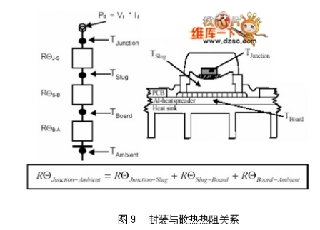 散熱設計是LED光源區別于傳統光源的課題之一。傳統燈具產生的熱遠高于LED,但傳統燈具不會因為高溫而降低其光源輸出能力,但LED的光輸出卻會隨著本身接口(Junction, PN接口)溫度的升高而下降,如圖8所示。而其產生的熱如何散除到外界環境與其封裝結構材料息息相關,牽涉到使用的散熱材料與相關外型,關系如圖9所示,其中熱阻的概念,代表輸入W功率時,需要提高多少K溫度才足以散熱。以現有的封裝技術最高可允許LED操作在185℃(Lumiled K2),但一般因為封裝膠材的關系,可允許的操作溫度約在125℃,除了考慮光源輸出效率之外,亦考慮封裝膠材的變質(樹脂類材料在高溫有老化現象)。