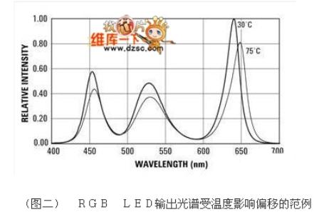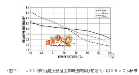 這類LED光源的簡單開迴路架構(gòu)方式有個潛在的問題,由于LED的光學(xué)特性會受到運作條件的影響,因此組合后的RGB光源輸出的亮度以及色度都會變化。同時,每顆LED元件也不盡相同,因此造成RGB光源的輸出產(chǎn)生更多變化,(圖二)與(圖三)就描述了幾個LED變動的范例。
