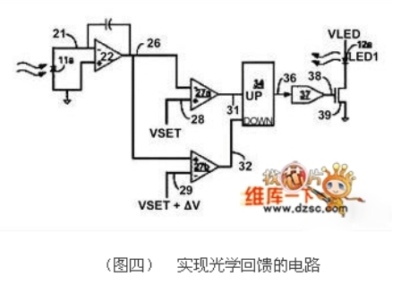 在(圖四)中,標記為22的積分電路可以輸出一個受到光二極管(11a)上光量控制的電壓,這個電壓與VSET比較,比較器的輸出能控制計數(shù)器數(shù)值的增加或減少,計數(shù)器的輸出則是用來推動一個數(shù)字模擬轉(zhuǎn)換器(37),進而控制LED的驅(qū)動電流。