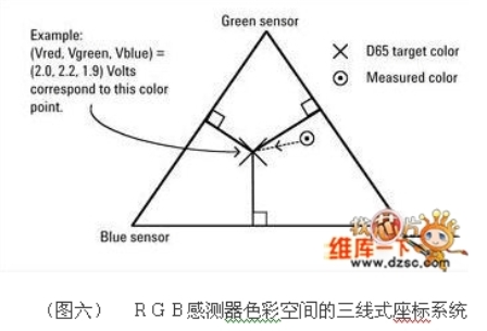 基本上來說,三色光感測器會產(chǎn)生一個三維色彩規(guī)格系統(tǒng),因此稱為RGB感測器色彩空間,這個系統(tǒng)可以讓特定色彩由感測器的輸出電壓來指定,例如具備特定亮度的D65白光可以記錄為:(Vred, Vgreen, Vblue)=(2.0, 2.2, 1.9)volts。