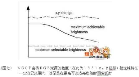 另一點相當重要,同時必須注意的是,當LED使用時間越久,光輸出強度就會降低,因此經(jīng)過一段時間后,RGB LED系統(tǒng)的最大可輸出亮度將會下降,雖然在大部分的應(yīng)用事實上都可以接受逐漸且穩(wěn)定的亮度衰減,但有時無法接受的是RGB發(fā)光系統(tǒng)色度的變化,ASSP擁有能夠穩(wěn)定控制RGB發(fā)光系統(tǒng)光度衰減的功能,例如維持色度的穩(wěn)定在一定的容忍度內(nèi),甚至當最高可輸出亮度下降時。
