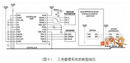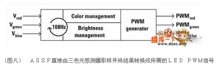 ASSP整合了一系列可以分析三色光感測器色彩資訊,并計算達成目標色的設(shè)定點及PWM驅(qū)動信號大小的一系列演算法。ASSP以大約每秒一百次的速度對光感測器進行取樣,以確保PWM信號的持續(xù)定期調(diào)整不會被人眼察覺,如前面所提,ASSP同時也包含一個可以避免LED老化而造成RGB光源輸出色度改變的演算法。