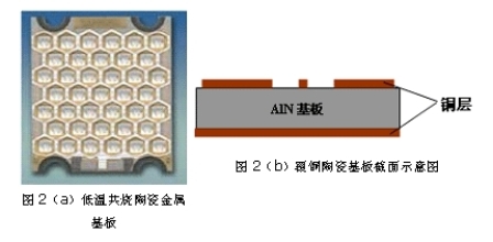 LED封裝熱阻主要包括材料(散熱基板和熱沉結構)內部熱阻和界面熱阻。散熱基板的作用就是吸收芯片產生的熱量,并傳導到熱沉上,實現與外界的熱交換。常用的散熱基板材料包括硅、金屬(如鋁,銅)、陶瓷(如Al2O3,AlN,SiC)和復合材料等。如Nichia公司的第三代LED采用CuW做襯底,將1mm芯片倒裝在CuW襯底上,降低了封裝熱阻,提高了發光功率和效率;Lamina Ceramics公司則研制了低溫共燒陶瓷金屬基板,如圖2(a),并開發了相應的LED封裝技術。該技術首先制備出適于共晶焊的大功率LED芯片和相應的陶瓷基板,然后將LED芯片與基板直接焊接在一起。由于該基板上集成了共晶焊層、靜電保護電路、驅動電路及控制補償電路,不僅結構簡單,而且由于材料熱導率高,熱界面少,大大提高了散熱性能,為大功率LED陣列封裝提出了解決方案。德國Curmilk公司研制的高導熱性覆銅陶瓷板,由陶瓷基板(AlN或Al2O3)和導電層(Cu)在高溫高壓下燒結而成,沒有使用黏結劑,因此導熱性能好、強度高、絕緣性強,如圖2(b)所示。其中氮化鋁(AlN)的熱導率為160W/mk,熱膨脹系數為4.0×10-6/℃(與硅的熱膨脹系數3.2×10-6/℃相當),從而降低了封裝熱應力。