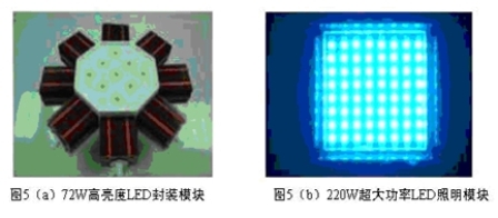 在系統集成方面,臺灣新強光電公司采用系統封裝技術(SiP), 并通過翅片+熱管的方式搭配高效能散熱模塊,研制出了72W、80W的高亮度白光LED光源,如圖5(a)。由于封裝熱阻較低(4.38℃/W),當環境溫度為25℃時,LED結溫控制在60℃以下,從而確保了LED的使用壽命和良好的發光性能。而華中科技大學則采用COB封裝和微噴主動散熱技術,封裝出了220W和1500W的超大功率LED白光光源,如圖5(b)。